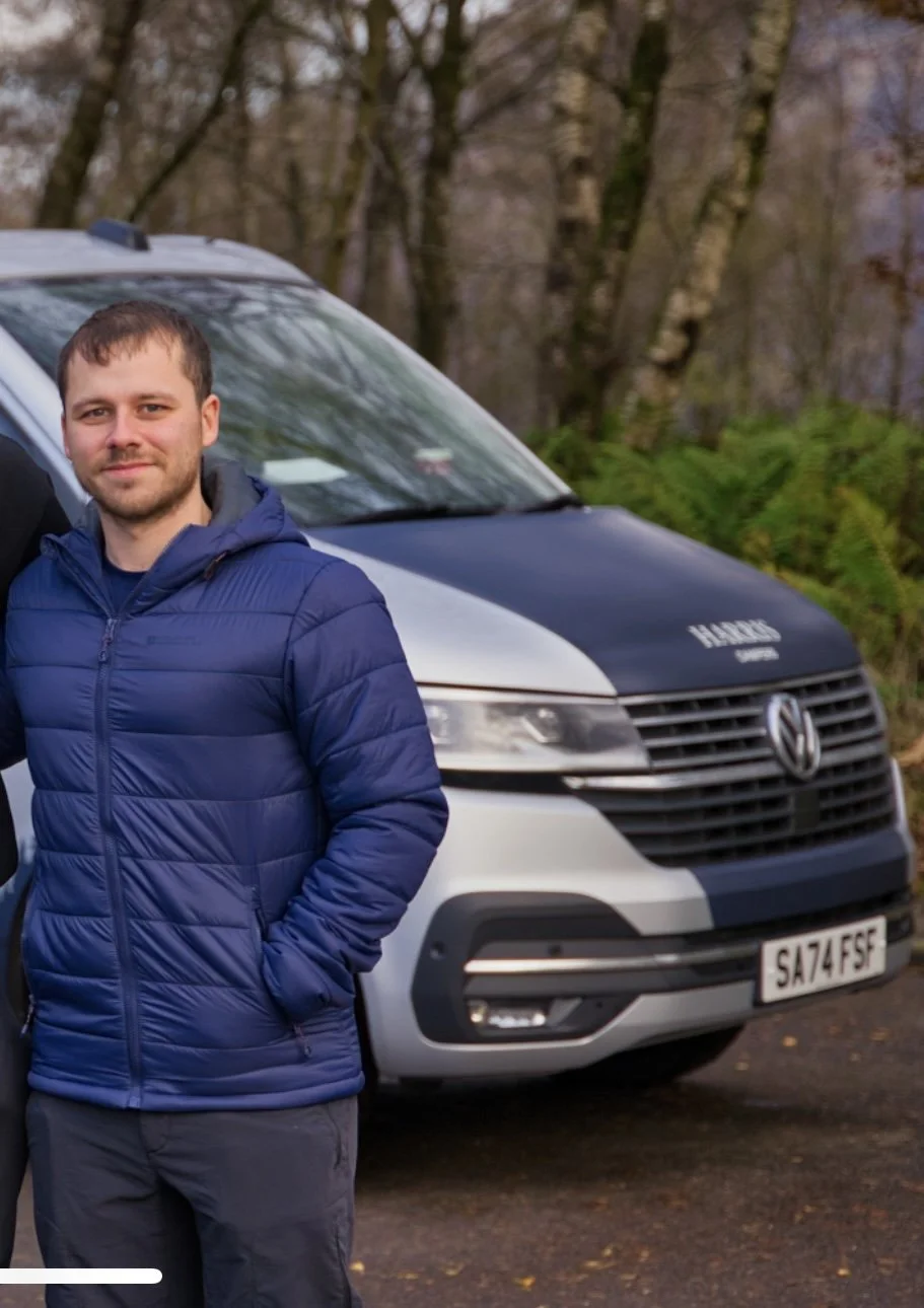 Hello, I’m Joshua. I’m one of the friendly faces behind the scenes at Harris Campers. Outgoing and full of energy, I’m most at home when I’m on the move — whether that’s helping guests get set up for their adventure or heading off into the hills myself.
